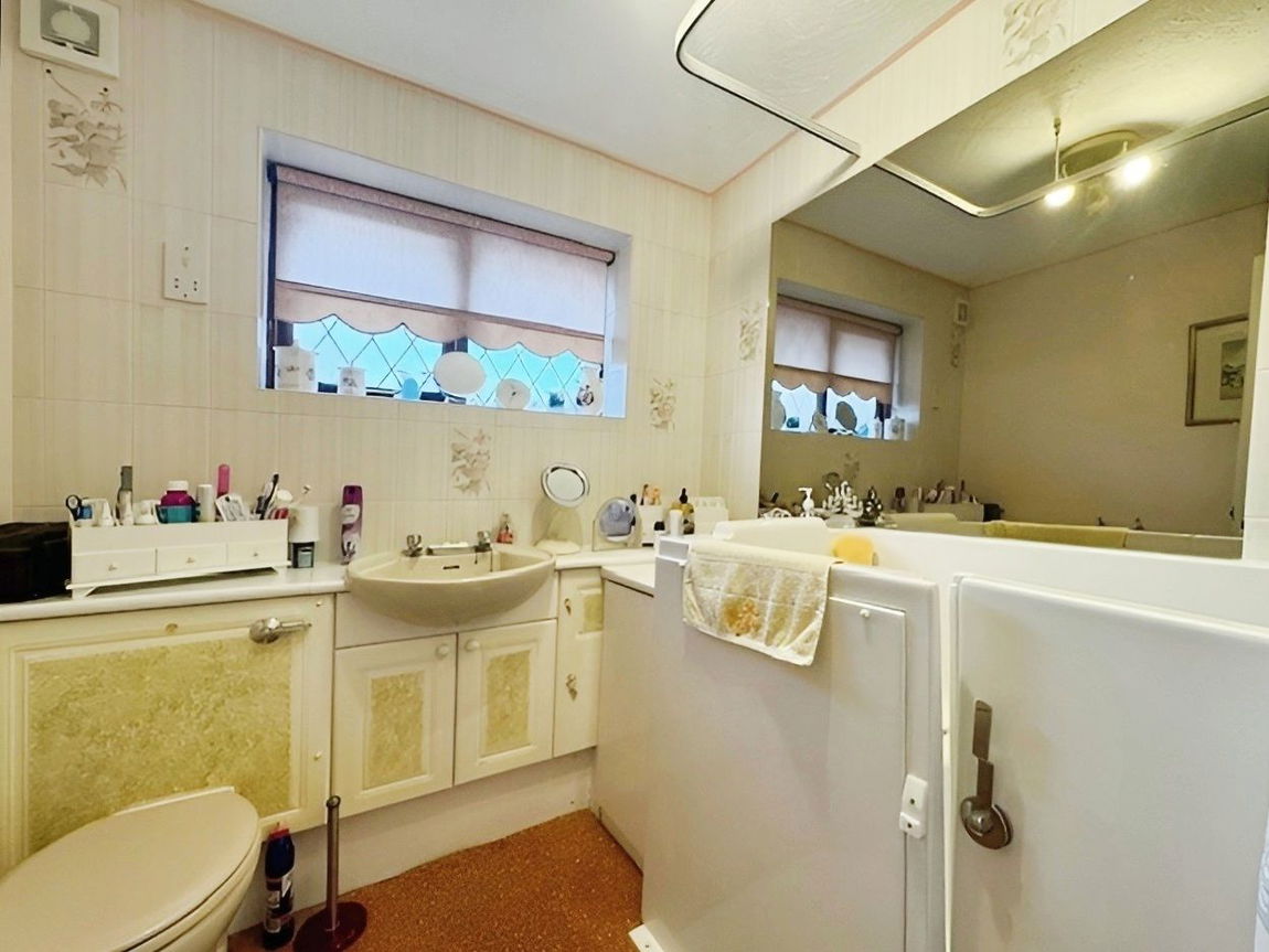Having a three piece suite comprising walk-in bath with shower, wash basin and w.c. set into vanity unit, part tiled walls, radiator and obscure glazed window.