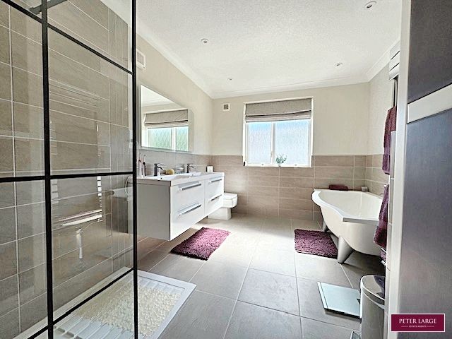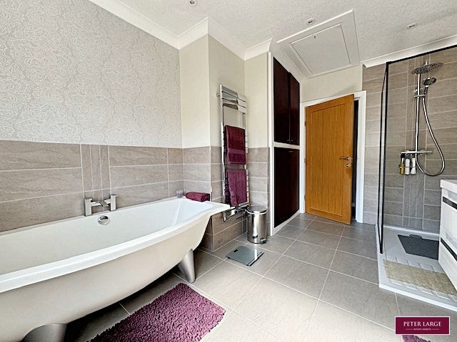 Having a four piece suite comprising large walk-in shower cubicle with glass screen, rainfall shower head and additional shower attachment, his and hers wash hand basin set into vanity unit with touch operated LED mirror, claw foot roll top bath with mixer tap, low flush WC, chrome heated towel rail, part tiled walls, complimentary floor tiles, built-in storage cupboard, loft access point with pull down ladder, inset spotlighting, coved ceiling and obscure glazed window.