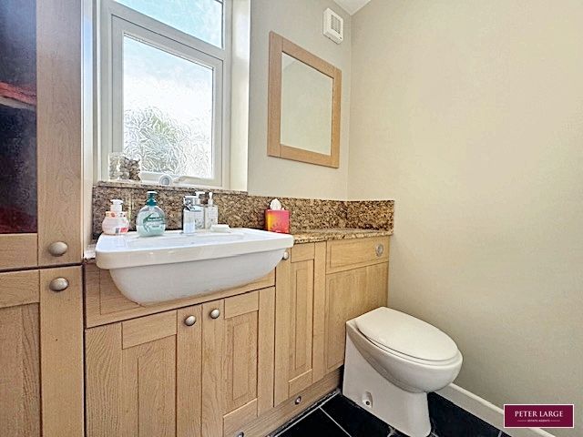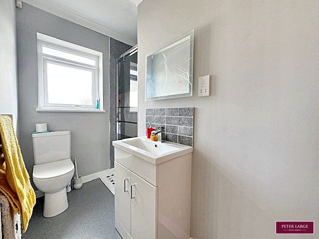 Having a three piece suite comprisng purpose built shower cubicle with glass door, wash hand basin set into vanity unit, low flush WC, obscure glazed window, inset spotlighting, coved ceiling, non slip style flooring and a heated towel rail.
