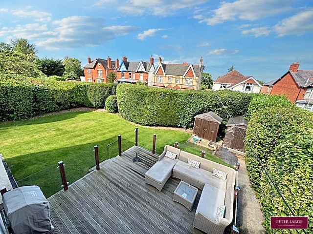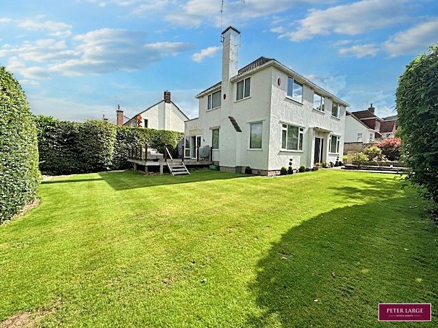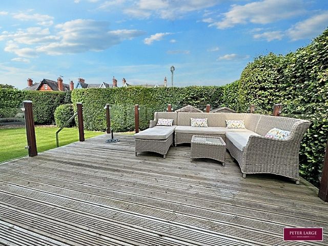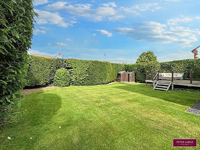 The property stands in large gardens that wrap around three elevations with vehicular access to the rear via double gates onto a paved driveway which accesses the attached GARAGE. The gardens are predominantly laid to lawn with a patio seating area, pathway leading to the side and front gardens with raised beds with a variety of flowers and plants. A pedestrian gate provides access to main entrance with awned gardens bounded by mature high hedging providing privacy with two constructed garden stores and raised decked seating area with glass panelling.