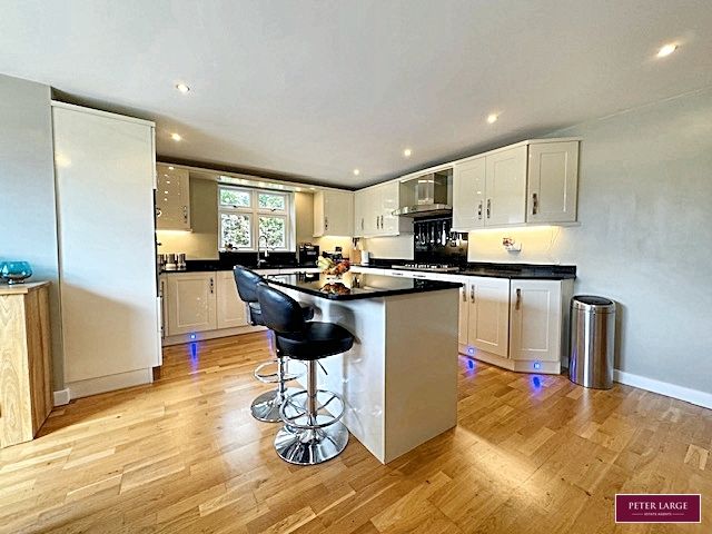 Having an extensive range of cream high gloss fronted base cupboards and drawers with granite worktop surface over, matching wall units, inset one and a quarter single drainer sink with hose style mixer tap, built-in appliances include an eye level Neff oven and grill, Neff microwave, wine cooler, integrated dishwasher with matching front decor panel. Having a feature central island with base cupboards and granite worktop surface incorporating breakfast bar, American style refrigerator surrounded by storage units, space for dining table, double glazed windows to front and side, oak flooring, power points, radiator, inset spot lighting and French doors giving access to a decked seating area.