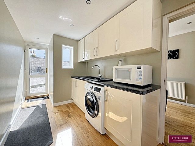 With a continuation of the oak flooring, a range of base cupboards with worktop surface over, inset single drainer black enamel sink, wall mounted units, window and door to rear elevation, power points and personal door to GARAGE which houses the Worcester gas fired boiler, power, light and up and over door.