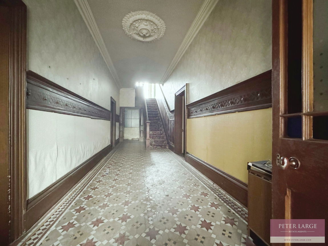 Having a continuation of the original patterned tile flooring, wood panelling, coved ceiling, ceiling rose, and staircase leading to first floor accommodation.
