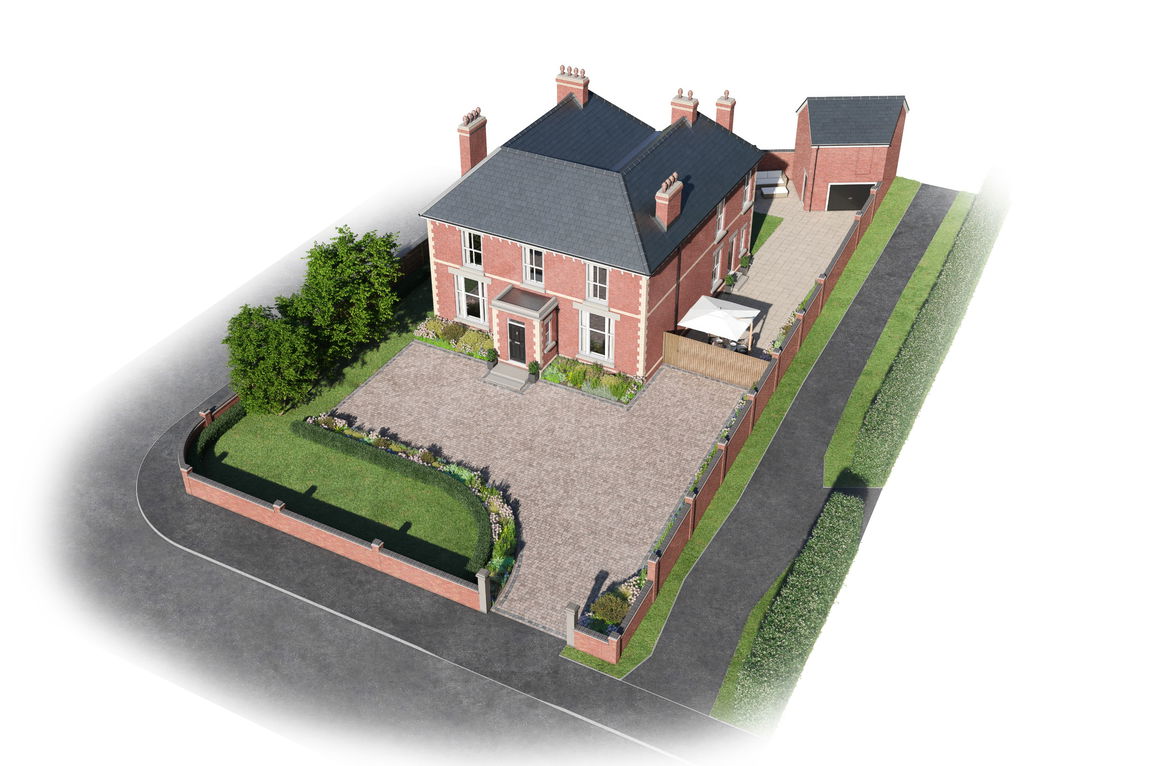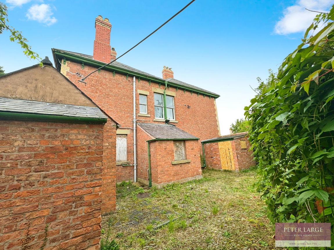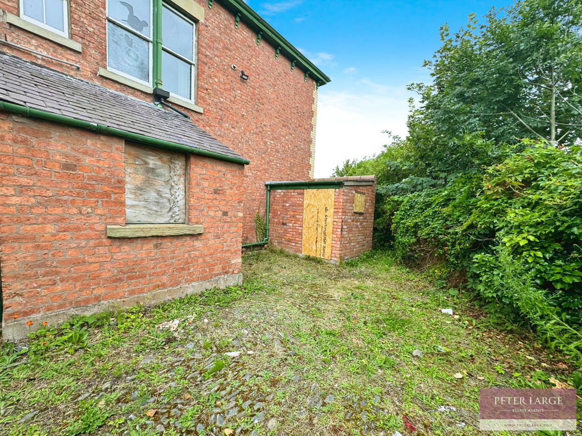 Double wrought iron gates lead onto driveway which sweeps around the front of the house and down the side to the garage. The large front garden is in need of landscaping and extends down the left side of the property to the rear some 3 meters wide to the border. The front garden is bordered by brick walling to the front and side with some mature trees and hedging to one side. To the rear is a single garage with stable to side and storage above having timber doors to front and side with attached brick store to side. Two further brick built attached storage sheds provide ample storage. The garden is bordered at the rear by tall brick walling with climbing plants.