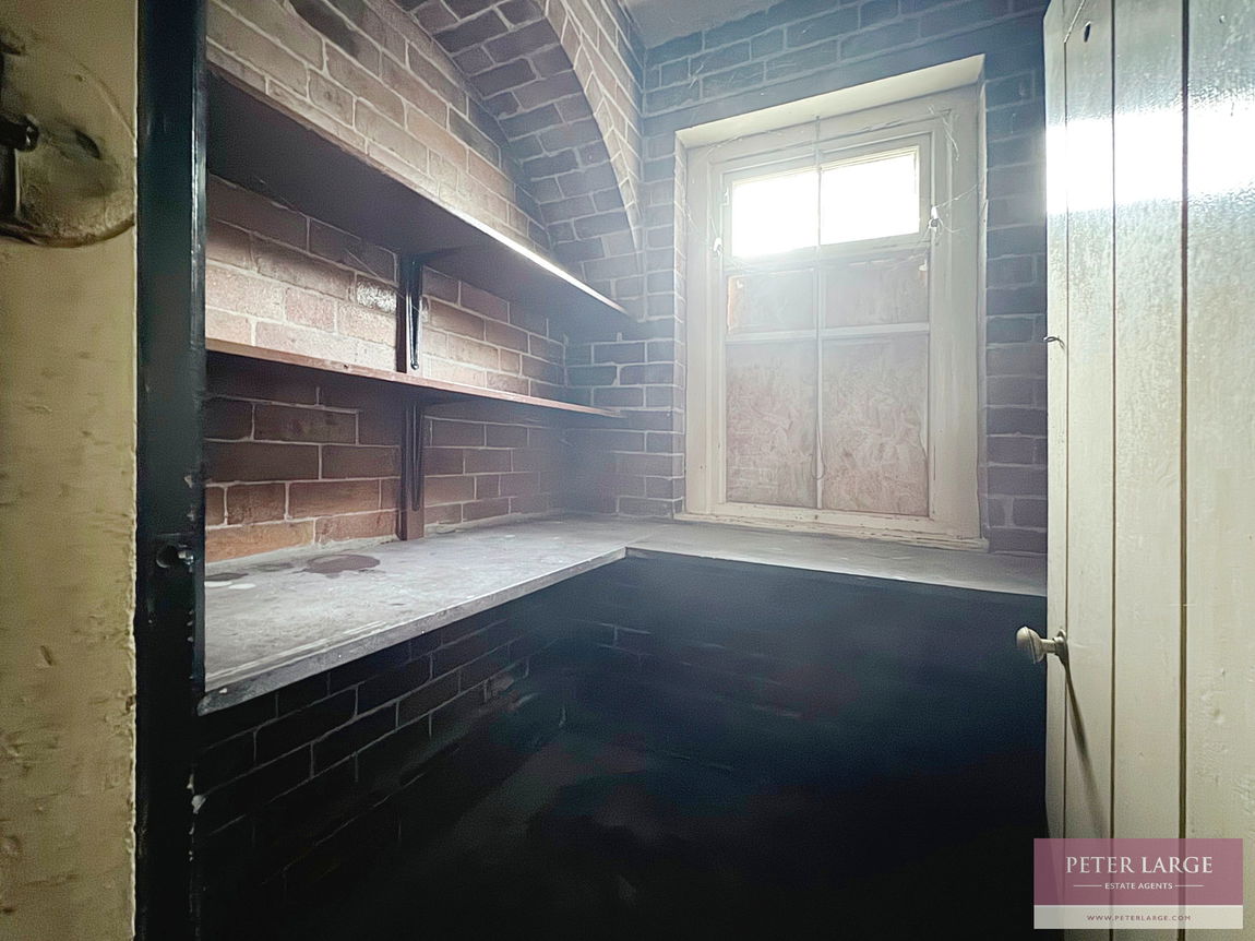 With small sash window overlooking the rear, stainless steel sink with double drainer and cupboard beneath, tiled floor and access into cold storage larder with original slate shelving and sash window looking out to the side.