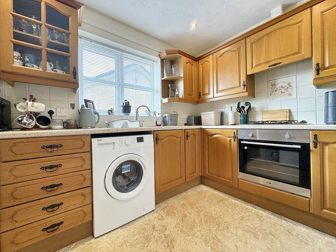 Fitted with a range of wooden wall and base units with worktops over. Fitted with part tiled walls, laminate flooring, gas hob, integrated oven, extractor fan, radiator, spot lights and power points. Single bowl sink and drainer. Space for a fridge freezer and washing machine. Window overlooking the side elevation. The wall mounted Glow worm boiler is housed in here.